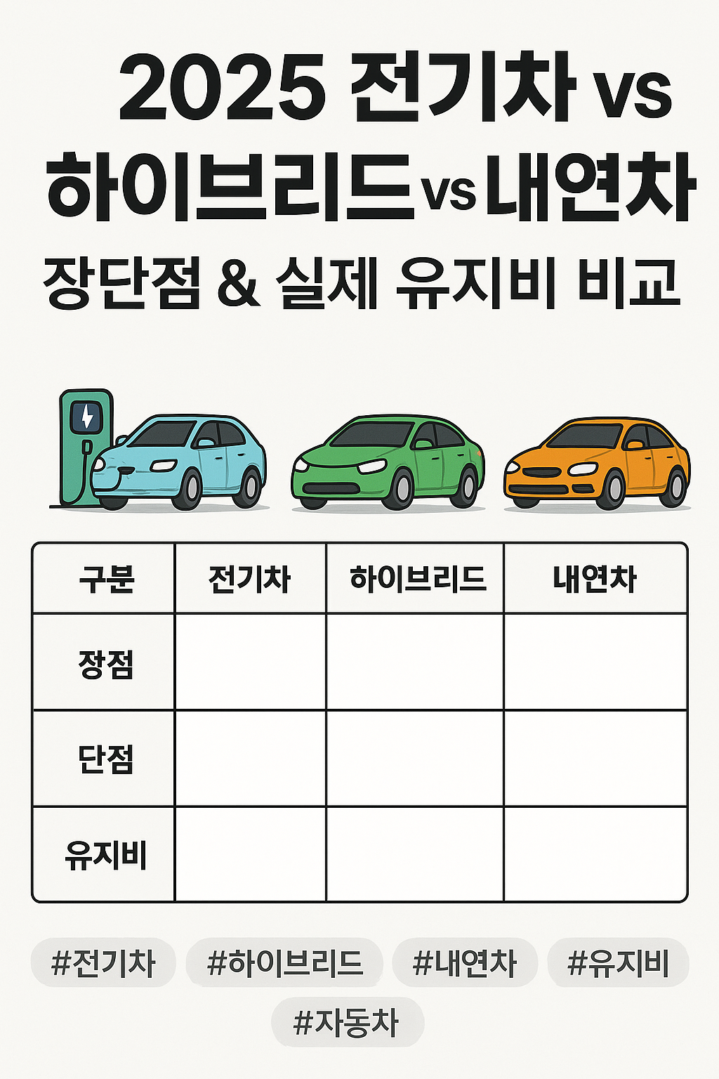 | 단점 | 충전 스트레스, 감가 위험, 장거리 비효율 | 배터리·모터 존재로 정비비↑ | 연비 부담, 세금·유류비 지속 상승 |